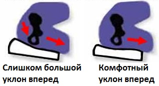 Уклон, это угол сидения от его передней части к задней. Он определяет как сильно водитель скатывается к баку, какова нагрузка на запястья и сколько мягких тканей отталкивается в сторону от седалищного горба. Больший уклон толкает ездока на бак и увеличивает давление на запястьях, а также выталкивает мягкие ткани из под седалищного горба тем самым раздражая его быстрее. На иллюстрация ниже приведена эта связь.