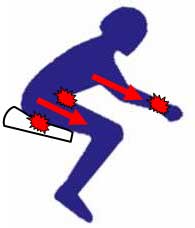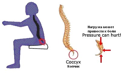 Следует отметить, что на ниже приведенной картинке показана довольно вертикальная (круйзерная посадка) или посадка на спорт-турерах. Такая посадка обычно оказывает более высокое давление на копчик. Ноги вытянуты вперед и таким образом не поддерживаю нагрузку, оказываемую на спину в вертикальном направлении. Спина также относительно прямая, что оказывает сгибающую нагрузку на копчик. Для большинства водителей это не проблема. Однако для тех, у кого бывает боль копчика, это может быть серьезным испытанием. Кроме медицинского лечения этой проблемы, есть некоторые вещи которые можно проделать с вашим сидением для того что бы облегчить эту боль. Смотри эту страницу для лечения болезни.