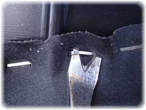 Если рама сидения не будет плотно во что-то упираться обо что вы сможете крепко прижать степлер, то в лучшем случае скоба зайдет в раму сидения лишь на половину. Если такое случится, то осторожно выдерните скобу таким образом что бы не повредить чехол (см раздел „удаление обшивки“) и попробуйте снова. Постарайтесь избегать повреждений той части чехла за которую вы собираетесь его сшить с рамой.