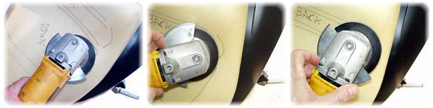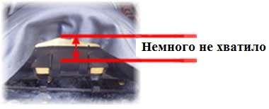 Если сборки будут слишком большими и будут видны после установки сидения, вы можете отрезать избытки винила ножницами потянув его за «уши» и отрезав на расстоянии примерно 0,5 дюйма от края (см фото ниже). В конце концов вы должны достигнуть результата при котором чехол гладок сверху и достаточно тонок снизу что бы плотно равномерно прилегать к нижнему обтекателю.