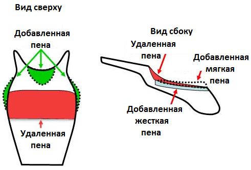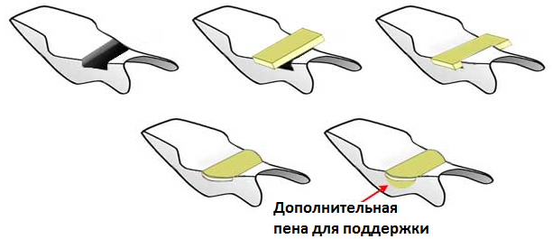 Как видно на последней картинке это позволяет добавлять и придавать форму маленькому куску пены что позволяет сгладить общую форму и увеличить поддержку в свисающей части. Точное место в котором необходимо увеличить ширину седла зависит от формы вашего тела и личных предпочтений. Рисунки являются лишь иллюстративными.