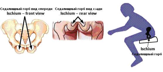 Скорее всего самое сложно преодолимое препятствие при поиске наиболее удобной посадки это боль костей седалищного горба. На рисунке видно, что седалищный горб является частью тазобедренного сустава. Эти кости несут основную часть веса седока во время движения. Некоторые сидения настолько неудобны, что кости седалищного горба начинают болеть уже через 30 минут после начала движения. О том насколько кости седалищного горба связаны с сидением и ездой говорит тот факт, что археологи древнего Китая оценивали по износу костей седалищного горба возраст солдат конной пехоты.