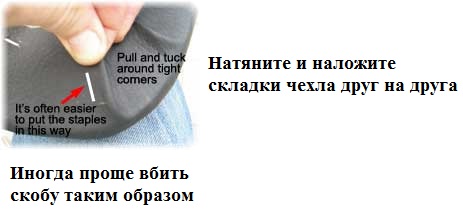 Примечание: Скорее всего вы будете несколько раз натягивать и снимать чехол, перетягивать его, забивать и выдергивать скобы. Вы не будете знать как закрепить чехол как следует и т.д. Просто будьте терпеливы, убедитесь, что вы натянули его равномерно и сильно по всей площади сидения. Повторите этот процесс несколько раз пока не добьетесь нужного вам результата. Почти наверняка это вам удастся. Может оно и не будет выглядеть как сшитые под заказ чехлы сидений от Russel, Sargent, corbin или Rick mayer, но оно будет достаточно красивым.