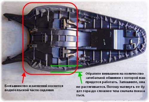 Иногда может случиться так, что после переделки сидения, чехла стандартного сидения будет не хватать на каком-нибудь одном не большом участке. В таком случае просто не сшивайте чехол с рамой сидения в этом месте. Вокруг этого места будет достаточно скоб что бы удерживать чехол на месте и это место будет не видно после установки сидения на мотоцикл. На фотография ниже приведен один пример такого случая.