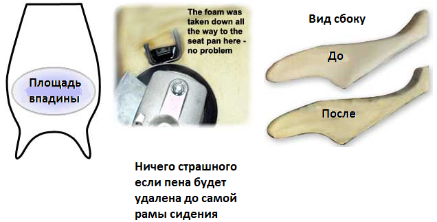 Надеюсь вы теперь имеете представление о том как нужно переделать сидение что бы оно стало более удобным и почему такие переделки имеют смысл. Итак, настало время удаления и изменения формы некоторой части пены стандартного сидения, а также добавления новой, более удобной пены. В конце концов вам необходимо найти наилучшее отношение уклона и поддержки.