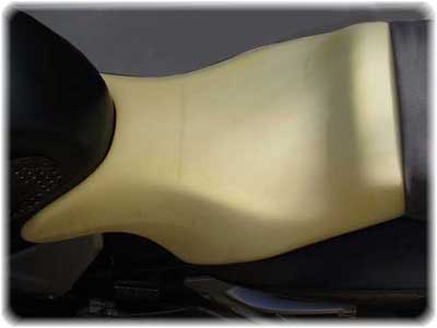 Ниже приведены еще две фотографий сидения Honda VFR. Уклон на сидении слева сильно уменьшен. Данная переделка также обеспечивает немного больше места для ног за счет увеличения высоты седла. Это снизить усталость ног в коленях при длительных поездках за счет меньшего изгиба сустава. Но такая переделка может не подойти людям маленького роста т.к. увеличенная высота сидения не позволит им достать ногами до земли. Обратите также внимание, что заводская обивка была сохранена экономя время и деньги. Может это сидение не выглядит столь красивым и дорогим как сидения сторонних производителей, но: 1) оно не столь уж и страшно выглядит, 2) никто не видит его когда я еду на мотоцикле, 3) эта переделка позволила мне поднять комфортное время в седле с 30 минут до 10 часов, и 4) эта переделка обошлась мне менее чем в 50$ с материалами.