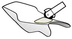 Сядьте на установленное на мотоцикле сидение и обратите внимание в котором месте кости седалищного горба оставляют наибольшие следы на сидении. Используйте белый мел, пастель, или что-то подобное, чтобы отметить эту область на сиденье. Вы можете вырезать выделенную область с помощью ножниц, ножа, или чего-то еще. Зона которую необходимо вырезать указана на картинке снизу буквой В. Если вы воспользуетесь ножницами, то сначала вам необходимо будет снять этот слой пены с сидения.