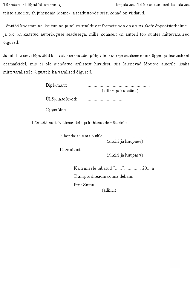 SISSEJUHATUSAlates Eesti taasiseseisvumisest on Eesti majandus jõudsalt kasvanud, mis on kaasa toonud suure autopargi kasvu. Seisuga 01.01.1999 oli Eestis 537 877 registreeritud sõidukit, seisuga 01.01.2009 aga juba 639 472 sõidukit[1]. Ehk kümne aastaga kasvas Eestis registreeritud sõidukite arv 101595 sõiduki võrra ehk umbes 18,8%. Poole sajandi taguse ajaga võrreldes on autode arv suurenenud 51,1 korda[2]. On üsna loogiline, et liikluses osalevate sõidukite arvu kasv tõi kaasa ka liiklusõnnetuste üldarvu kasvu. Kuid vaadates Eesli liiklusõnnetuste statistikat, võib märgata, et mõningatel aastatel on liiklusõnnetuste arv kasvanud kiiremini kui liikluses osalevate sõidukite arv. Nii oli näiteks 2000.a. liiklusõnnetuste arv kasvanud võrreldes eelmise aastaga 1,02 korda, 20001.a. 1,25 korda ning 2002.a. 1,16 korda[3]. Samas oli 2000.a. ja 2001.a. registreeritud sõidukite arv võrreldes eelmiste aastatega kasvanud 1,01 korda ning 2002.a. isegi vähenud 0,89 korda[4]. Ehk nendel aastatel oli Eesti liiklus muutunud ohtlikumaks. Sellele faktile viitab ka asjaolu, et 2003.a seisuga oli Eesti Euroopa üks madalama liiklusohutuse tasemega riike[5]. Sellest tulenevalt kinnitas 2003.a. Eesti Majandus- ja kommunikatsiooniminister Eesti Vabariigi Valitsuse poolt esitatud Eesti Rahvusliku liikluohustusprogrammi aastateks 2003 – 2015. Programmis sisalduvate tegevuste eesmärk on aastaks 2015 saavutada Eestis olukord, millal liiklusõnnetustes hukkunute arv aastas ei ületa 100. Nimetatud programmi kohaselt peamisteks meetmeteks, mida tuleks rakendada liikluohustuse tõsmiseks, on muuhulgas hoiakute kujundamine ja planeerimine[6]. Käesoleva töö autor on samuti arvamusel, et liiklejate käitumise mõjutamine avaldab liiklusohutusele oluliselt suuremat mõju kui tugev sõiduvahendite tehniline kotroll või mõni muu tehniline meede (nt liiklusjärelevalve tõhustamine). Lisaks leiab töö autor, et sellele teemale peaks sõidukite juhtide koolitamisel osutama suuremat tähelepanu, mille tõttu autor valis lõputöö teemaks just selle teema. . Käesoleva töö eesmäk on kirjeldada Teede- ja Sideministri määruses „B-kategooria ja B1-alamkategooria mootorsõiduki juhi ettevalmistamise riiklik õppekava“ (edaspidi Riiklik Õppekava) kehtestatud 19nda teema sisu. Nimetatud tunni teema Riikliku Õppekava kohaselt on „Sõidu kavandamine riski vältimise eesmärgil“. Kuigi Riikliku Õppekava kohaselt on nimetatud teema piiratud vaid järgmiste sõidukijuhi oskustega (mida õpilane peab omandama selle teema läbimisel): a) oskama arvesse võtta teekonna pikkust, sõiduaega ning enda kui juhi suutlikkust; b) oskama arvesse võtta tee- ja ilmaolusid sõltuvalt aastaajast; c) oskama arvesse võtta teede seisukorda, ohtlikkust ja liiklustihedust; d) oskama eriti pikkadel teekondadel teha valikut kaardi järgi, valida teed teenumbri järgi ning juhinduda teeviitadest ja teistest liiklusmärkidest; e) oskama arvesse võtta sõiduki tehnilist seisukorda ja komplektsust, tee sõidetavust, teeninduspunktide ja sõiduki tankimise võimaluse olemasolu, juhile ja kaassõitjatele vajalikke puhkepeatusi ja ööbimiskohti, juhile ja kaassõitjatele vajalikku riietuse ja muu varustuse olemasolu,[7] laiendab töö autor oma töös mõistet „sõidu kavandamine riski vältimise eesmärgil“ ning käsitleb töös ka teisi aspekte millistele enne sõidu alustamist tähelepanu pöörates on tulevasel autojuhil võimalik vältida või minimiseerida sõiduki juhtimisega seotud riske. Selle tõttu peab autor vajalikuks rõhutada, et sõnaühendi „sõidu kavandamine“ või „sõidu planeerimine“ kasutamisel peab autor silmas sõidu tervikuna planeerimist. St nii teekonna ehk konkreetse marsruudi planeerimist kui muude selle marsruudi läbimiseks vajalike tegevuste planeerimist (nt sõiduki tehniline kontroll, A kategooria sõiduki puhul vastava sõiduvarustuse olemasolu jne) ning sõnaühendi „teekonna kavandamine“ või „teekonna planeerimine“ kasutamisel peab autor silmas vaid kaardil konkreetse marsruudi planeerimist. Kuna töö autor taotleb nii B kui ka A kategooria sõiduki juhtide koolitamise õigust, on töös kirjeldatud ka A kategooria sõidukiga sõidu planeerimise eripärasid. Käsitletud on ka õppija (sh täiskavanu) õpetamise eripärasid millistega peab autokooli õpetaja oma töös arvestama. Töös on autor kasutanud numbrilist viitamist, kuid erinevalt Tallinna Tehnikakõrgkooli kirjalide tööde vormistamise juhendis sätestatule, näitab viitenumber viite järjekorda mitte ei viita kasutatud kirjanduse loetelus sama järjekorra numbri all olevale allikale. Lehekülje alumises osas on vastava numbri järel toodud kasutatud allika andmed lühendatud kujul mille alusel on võimalik töö lõpus olevast kasutatud kirjanduse loetelust leida põhjalikud vastava allika andmed. Selline viitamine on tingitud asjaolust, et töö autorile teadaolevalt ei võimalda lõputöö koostamisel kasutatud tarkvara „Microsoft Word 2002“ automaatset viitamist muul kujul. Kui viite järjekorra number seisab: a) lause sees, viitab see sellele, et viide laieneb konkreetsele sõnale või arvandmele; b) lause lõpus enne punkti, viitab see sellele, et viide laieneb vaid sellele lausele; c) lause lõpus peale punkti, viitab see sellele, et viide kehtib lõigu piires tagasiulatuvalt kuni esimese viite järjekorra numbrini või selle puudumisel kuni lõigu alguseni; d) lause sees jutumärgi järel või lause lõpus jutumärgi järel kuid enne punkti, viitab see sellele, et viide kehtib üksnes jutumärkides toodud tekstile ja andmetele. 1. ÕPETAMISE ERIPÄRADÕpetades autokoolis tuleb õppetajal lähtuda sellest, et tegemist on täiskasvanud õppijatega, kellel on olemas teatud elukogemused, välja kujunenud isiksus ja põhimõtted. Need ja paljud muud faktorid võivad mõjutada õpilase poolt teadmiste omandamist. Üheks selliseks faktoriks on nt õpilase temperament. Inimtemperamenti o