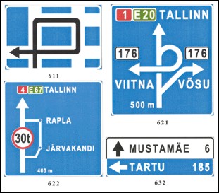 Joonis 4.[21] Juhatusmärgid (liiklusskeemid) 2.2.3 Sõiduteekonna kavandamine elektroonilise kaardi järgiInternetis kättesaadavad elektroonilised kaardid (nt üks levinuimatest asub aadressil: http://maps.google.com/) on sarnaselt GPS seadme kaartidele väga põhjalikud. Samuti võimaldavad need sülearvuti, vastava antenni, tarkvara ning sõidu ajal interneti püsiühenduse olemasolul suunata juhti reaalajas sarnaselt GPS seadmele. Selliste kaartide eelisteks on tasuta kättesaadavus ning mugavam kaardi vaade tänu suurele ekraanile. Sellised kaardid võivad pakkuda üheaegselt mitu erinevat marsruuti (vt joonis 5) milliseid juht saab kiirelt omavahel võrrelda ning valida endale sobivaima. Samuti võimaldab elektrooniline kaart kavandada teekonda erinevate sõiduvahenditega (nt ühistransport, sõiduauto, jalgratas, jala jne). Vaatamata kõikidele elektroonilise kaardi eelistele on nagu ka GPS seadme puhul tegemist elektroonilise seadmega mis võib rikki minna. Samuti reaalajas navigeerimiseks nõuab see suuri rahalisi kulutusi tark- ja riistvarale. Arvestades paber- ja elektrooniliste kaartide ning GPS seadmete puudusi ja eeliseid, soovitab käesoleva töö autor pikemaid marsruute eelnevat planeerida elektrooniliste kaartide abil ja sõidu ajal kasutada paberkarti või GPS seadet. GPS seadme kasutamisel soovitab töö autor omada sõidukis marsruudi ala katvat atlast.
