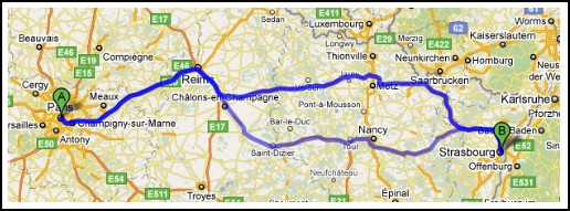 Joonis 5.[22] Elektroonilised kaardid pakuvad üheaegselt erinevaid marsruute (joonisel võimalikud Pariis – Strasburg marsruudid) 2.3 Sõidu kavandamineKäesoleva töö 2.1 peatükis leiab autor, et sõidu teekonna kavandamine on vaid üks osa terve sõidu kavandamisest. Selleks, et pidada sõitu põhjalikult kavandatuks, peab juht lisaks teekonnale läbi mõtlema ka rida muid aspekte. Nt peab ta veenduma selles, et ta suudab plaanitud teekonda iseseisvalt läbida ehk ta peab olema kindel, et tema tervislik seisund, sõiduki tehniline seisukord, tee- ja ilmaolud võimaldavad tal plaanitud marsruut läbida kõrvalise isikute abita ning täiendavaid riske võtmata. Eriti tähtis on see pikemate marsruutide puhul ja tundmatusse kohta suundumisel. Juht peab ka arvestama linnasisese, riigisisese ja riigivälise sõidu kavandamise eripäradega. Lisaks sellele peab juht sõitu kavandades arvestama sellega, et ta saab oluliselt vähendada sõiduga kaasnevaid riske kui tal on olemas teadmised, oskused ja tahe õigesti kasutada sõiduki turvasüsteeme (sh turvavöö, peatugi, laste turvatoolid) ning lisavarustust (sh telefoni „käed vaba“ süsteem, GPS seade, telefoni hoidjad jms), hoida kaasasveetavaid esemeid ohututes kohtades, jälgida sõiduki tootja poolt ette nähtud sõiduki hooldusvälpasid jne. Juht peab enne pikema sõidu alustamist läbi mõtlema ka, kas ja kus tema ja ta kaaslased hakkavad ööbima, kas plaanitud teekonnal on piisavas koguses olemas sõiduki tankimise võimalusi, arvestama võimaliku ilma muutusega jne. Töö 2.3 peatükis käsitletaksegi kõiki käesolevas lõigus mainitud aspekte. 2.3.1 Asulasisese teekonna planeerimise eripäraIgapäevaseid sõite tehakse tavaliselt väljakujunenud marsruute mööda ja seal valitsevad teeolud ja ohud on juhile üldjuhul tuttavad. Selle tõttu tihti ei mõtle juhid selle peale, kas on võimalik igapäevaseid sõite ohutumaks ja säästlikumaks muuta. Reeglina langevad enamus linnasõite hommikustele ja õhtustele tipptundidele. Liiklemine on sellistel tundidel oluliselt raskendatud liiklusummikute tõttu. Ebasoodne liikluskord liiklusummikutes põhjustab kütusekulu suurenemist, sõiduki kulumise kiirenemist, õhu kvaliteedi halvenemist ja mürareostuse suurenemist. Sihtkohta hilinemise ohu ja sundseisust väljapääsu otsimise tõttu sooritavad juhid ohtlikke manöövreid, mis võivad lõppeda liiklusõnnetustega. Neid ebameeldivusi võib vältida või nende mõju juhile vähendada, kui valida alternatiivne transpordi vahend. Näiteks on linnatingimustes väga kiire transpordivahend jalgratas. Samuti kui on vajadus sõita regulaarselt ühel ja samal marsruudil, siis võiks proovida kasutada ühistransporti, tutvudes eelnevalt selle sõiduskeemi ja töögraafikuga. Ühistranspordiga on sihtkohta jõudmine ohutum, odavam ja mõnikord isegi mugavam, kui enda sõidukiga kuna suurtes linnades või tekkida probleeme sõidukile parkimiskoha leidmisega. Tuttav teekond, isegi kui ta on veidi pikem, on alati parem kui tundmatu. Linnatingimustes, sõites igapäevaselt mööda ühte ja sama teed, võib kogemuse põhjal määrata liikumise kiirust ja viisi, mis võimaldab sõita peatusteta, vähendades kiirust potentsiaalse ohu kohtades. Kuid tuttavas piirkonnas liikudes ei tohiks unustada liiklusmärkide, teekattemärgistuse jms jälgimist kuna need võivad aja jooksul muutuda, ning sõites nö „mälu“ järgi võib juht sattuda liiklusohtliku olukorda või isegi liiklusõnnetusse. Kui tekib vajadus sõita linna tundmatusse piirkonda kus juht pole varem juhina liikluses osalenud, peaks juht eelnevalt paber või elektroonilist kaarti kasutades uurima kus täpselt temale vajalik objekt asub. Paremaks orienteerumiseks tasub meelde jätta vahetus läheduses asuvate ühistranspordi peatuste ja kõrvaltänavate nimed. Enne tundmatusse kohta sõidu alustamist peaks ka uurima parkimise võimalusi koha peal. Eriti see puudutab suuremate linnade kesklinna ja puhkepiirkondadesse (nt mereäärsed piirkonnad) minnes. Linnas liigeldes võiks autojuht päeva alguses oma päeva plaani läbi mõelda, ning võimalusel järjestada oma tegevused sellises järjekorras, et külastamist vajavad kohad jääksid planeeritud marsruudi peale sellises järjekorras, et oleks võimalikult vähe „sinna-tagasi“ sõitmist. 2.3.2 Asulavälise teekonna planeerimise eripäraEestis jagunevad teed põhi-, tugi- ja kõrvalmaanteedeks ning kohalikuks ja taliteedeks.[23] Enne Eesti sisese reisi ettevõtmist tundmatusse kohta või kohta kus juht pole viimase mitme kuu jooksul käinud, peaks juht samuti oma marsruudi läbi mõtlema. Marsruudi läbi mõtlemisel peaks ta arvestama aastaajaga, ilmaoludega. Samuti on soovitav uurida teede seisukorda, valitud marsruudil planeeritaval sõidu ajal kehtestatud kiirusepiirangut ning veenduda remontööde puudumises valitud marsruudil. Viimases lauses nimetatud asjaolusid on võimalik kontrollida Maanteeameti interneti leheküljel. Sõltuvalt reisi eesmärgist tuleks mõelda ka sellele, millist tee tüüpi eelistada. Kui reisi eesmärk on võimalikult kiiresti punktist A punkti B jõudmine, tuleks eelistada põhimaanteesid, kuna teekatte kvaliteet ning liikluskorraldus on nendel parem ning selle tõttu ka maksimaalne lubatud sõidukiirus suurem. Kohaliku maaelu eripärade vaatamiseks on aga mõistlikum valida kõrvalmaanteesid või isegi kohalike teesid, kuna põhi- ja tugimaanteed on oma suure koormuse tõttu võimalusel suunatud asulate ümber. Samas võtab talvel kohalike teede lumest puhastamine rohkem aega kui põhimaanteedel. Sellega tuleb arvestada kui sõit planeeritakse hommikul ning öösel sajab lund. Kui tegemist on pideva tugeva lumesajuga siis võib juhtuda, et kohalik tee saab lumest puhtaks alles mõni päev peale lumesaju lõppemist. Mõlemal juhul tuleks vältida kruusakattega teesid kuna nendel sõit on väsitav nii juhile kui ka sõidukile tee tolmu ja kivide tõttu. 2.3.3 Pikema (riigivälise) teekonna planeerim