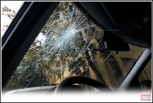 Joonis 6.[28] Turvavööga kinnitamata katsemannekeeni „peaga“ põhjustatud esiklaasi vigastus avarii testi käigus kiirusel 15km/t.