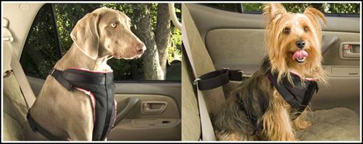 Joonis 11.[49] Eseme turvavööga kinnitamise näide Suurt ohtu kujutavad endast reisijatele ka kinnitamata koduloomad. Need tuleks samuti kinnitada sõiduki turvavööde külge spetsiaalsete koduloomadele mõeldud turvavöödega (vt joonis 12). Tänavapildis võib tihti kohata olukorda kus juhi kõrvalistujad hoiavad süles sülearvuteid (või isegi kasutavad neid), spordikotte, koduloomi ja muid esemeid. Selline käitumine kaasreisijate poolt on aga veel ohtlikum kui auto salongis olevad lahtised esemed kuna liiklusõnnetus puhul jäävad sellised esemed sõitja ja avaneva turvapadja vahele. Arvestades turvapadja avanemise kiirust (kuni 50/1000 sekundit)[50] on üsna tõenäoline, et reisija saab sellises olukorras väga tõsised keha esiosa vigastusi. Selle tõttu peab juht enne sõidu alustamist alati veenduma, et kõik sõitjad on turvavöödega nõuetekohaselt kinnitatud, et kõik kaasasveetavad esemed on paigaldatud pagasi ruumi või salongis asuvad esemed on turvavöödega kinnitatud ning, et reisijate ja sõiduki turvapatjade vahel ei asu selleks mitte ette nähtud esemeid. Viimane asjaolu puudutab sõiduki kõiki turvapatju (sh külgmised turvakardinad).